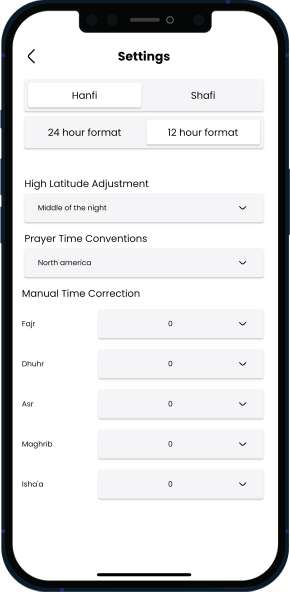 • Prayer Times (Hanfi, Shafi, Latitude Adjustment, Prayer Time Conventions, Manual Time Correction, Time Alerts)